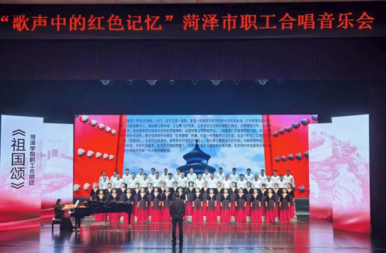 近日,由菏泽市总工会主办的"歌声中的红色记忆"职工合唱音乐会在菏泽大剧院隆重举行。来自全市各条战线的多支职工合唱团齐聚一堂,用歌声重温红色经典,共同纪念中国人民抗日战争暨世界反法西斯战争胜利八十周年。菏泽学院音乐与舞蹈学院职工合唱团参加此次音乐会,菏泽学院党委副书记孟令美、菏泽学院工会主席许庆喜出席活动。